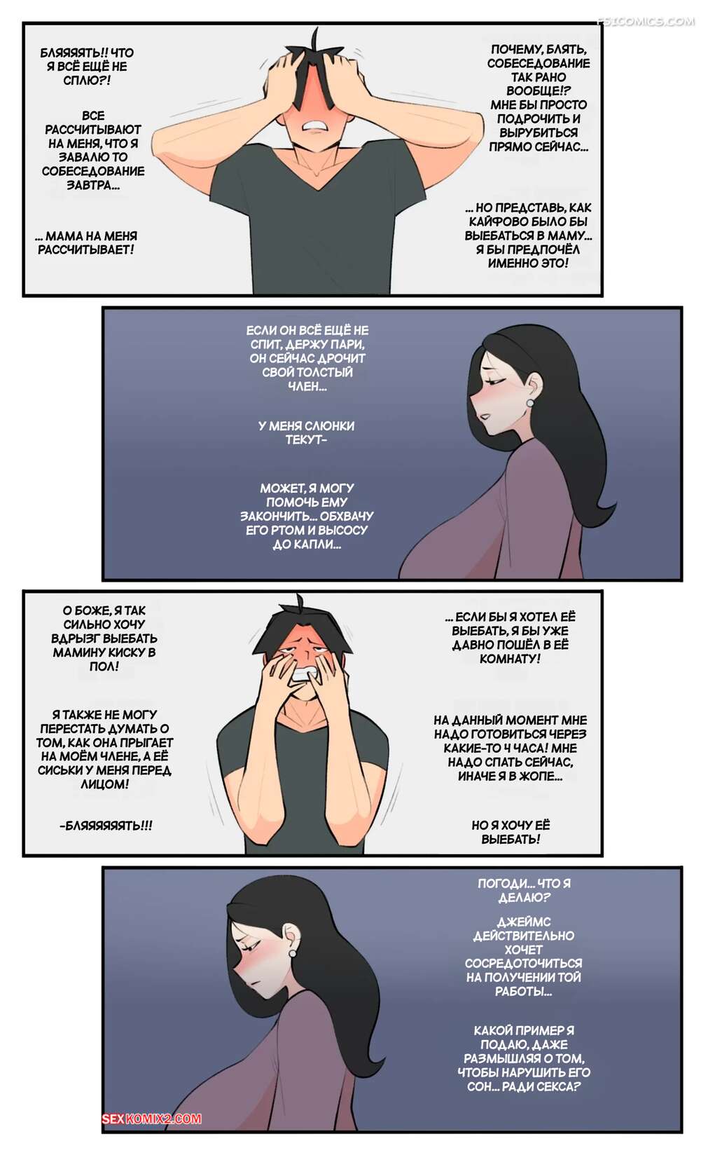 Порно комикс Лиза и Джеймс. Разрушенная кровать. Lisa and James. Breaking Bed. Jopuari. Горячая брюнетка испытывает сексуальное влечение к своему сыну, но ей приходится сдерживаться изза присутствия своей сестры. Красотка отправляется принять ванну и ласкает там свою пизду, думая о сыне.